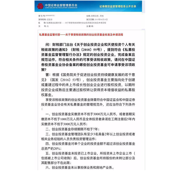 6月19日,證監(jiān)會(huì)發(fā)布了與“財(cái)稅55號(hào)文”有關(guān)的《私募基金監(jiān)管問(wèn)答——關(guān)于享受稅收政策的創(chuàng)業(yè)投資基金標(biāo)準(zhǔn)及申請(qǐng)流程》,明確了可申請(qǐng)享受該優(yōu)惠政策的創(chuàng)投基金所應(yīng)該具備的條件。